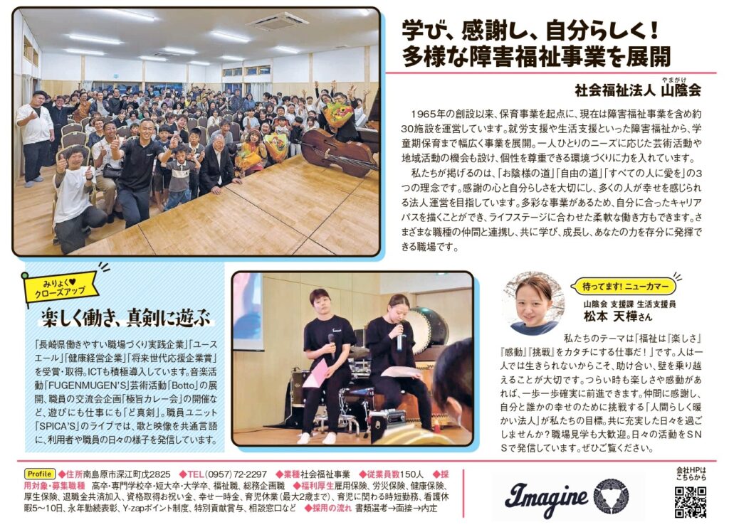 2025年10月1日 / 最終更新日時 : 2025年10月8日 yamakage 【お知らせ】『長崎新聞「おしごとstyle」で社会福祉法人 山陰会を紹介して頂きました!』 長崎新聞「おしごとstyle」に山陰会の取り組みや活躍する新人の職員さんを紹介して頂きました!! 現在、山陰会では日々「福祉は”楽しさ”、”感動”、”挑戦”をカタチにする仕事だ!」をテーマに様々な活動にチャレンジしているところです。 今後もご利用者さん、子供たちの豊かな毎日と職員の成長のために積極的に挑戦を続けていきたいと考えております! FacebookXHatenaPocketCopy